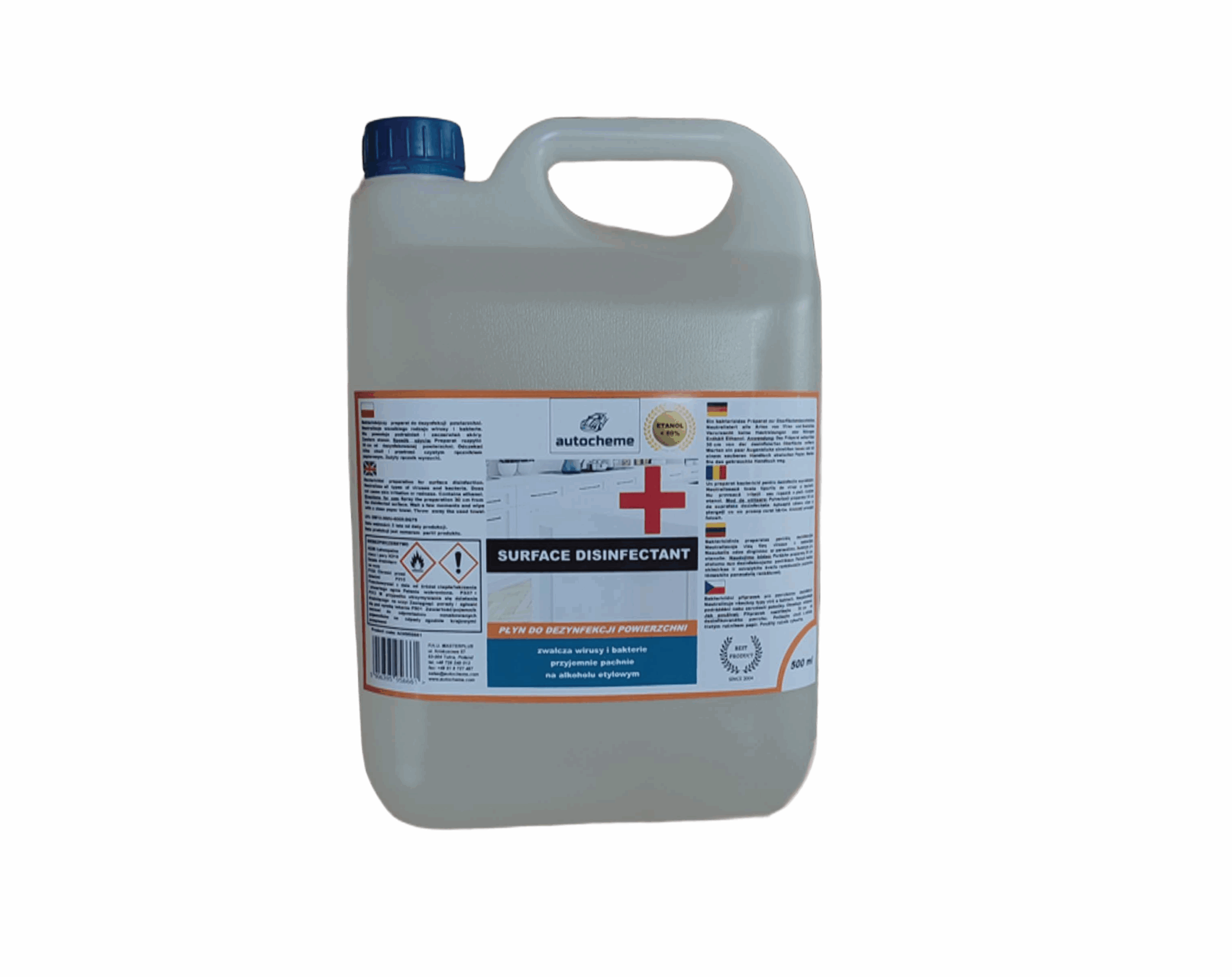 Wysokiej jakości płyn do dezynfekcji powierzchni w opakowaniu kanister 5L. Produkt na bazie alkoholu etylowego w stężeniu <80%.
