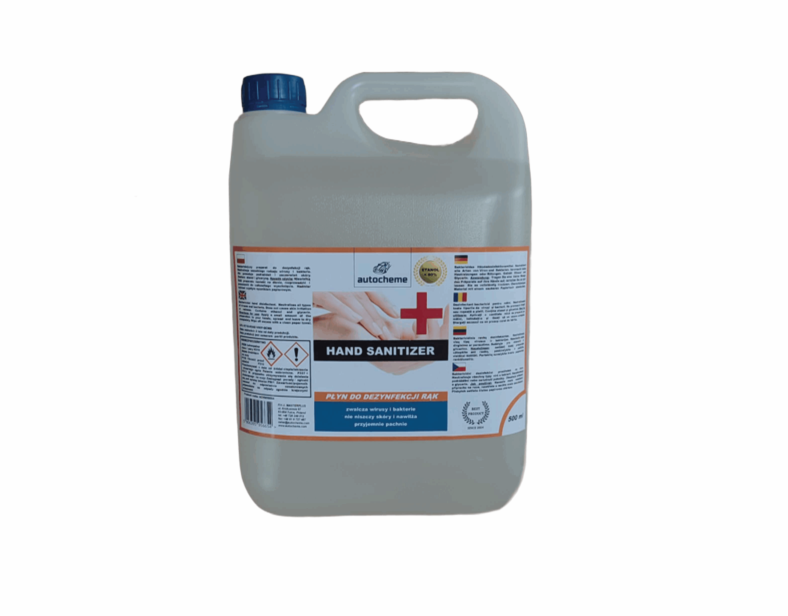 Wysokiej jakości płyn do dezynfekcji rąk w opakowaniu kanister 5L. Produkt na bazie alkoholu etylowego w stężeniu <80%.